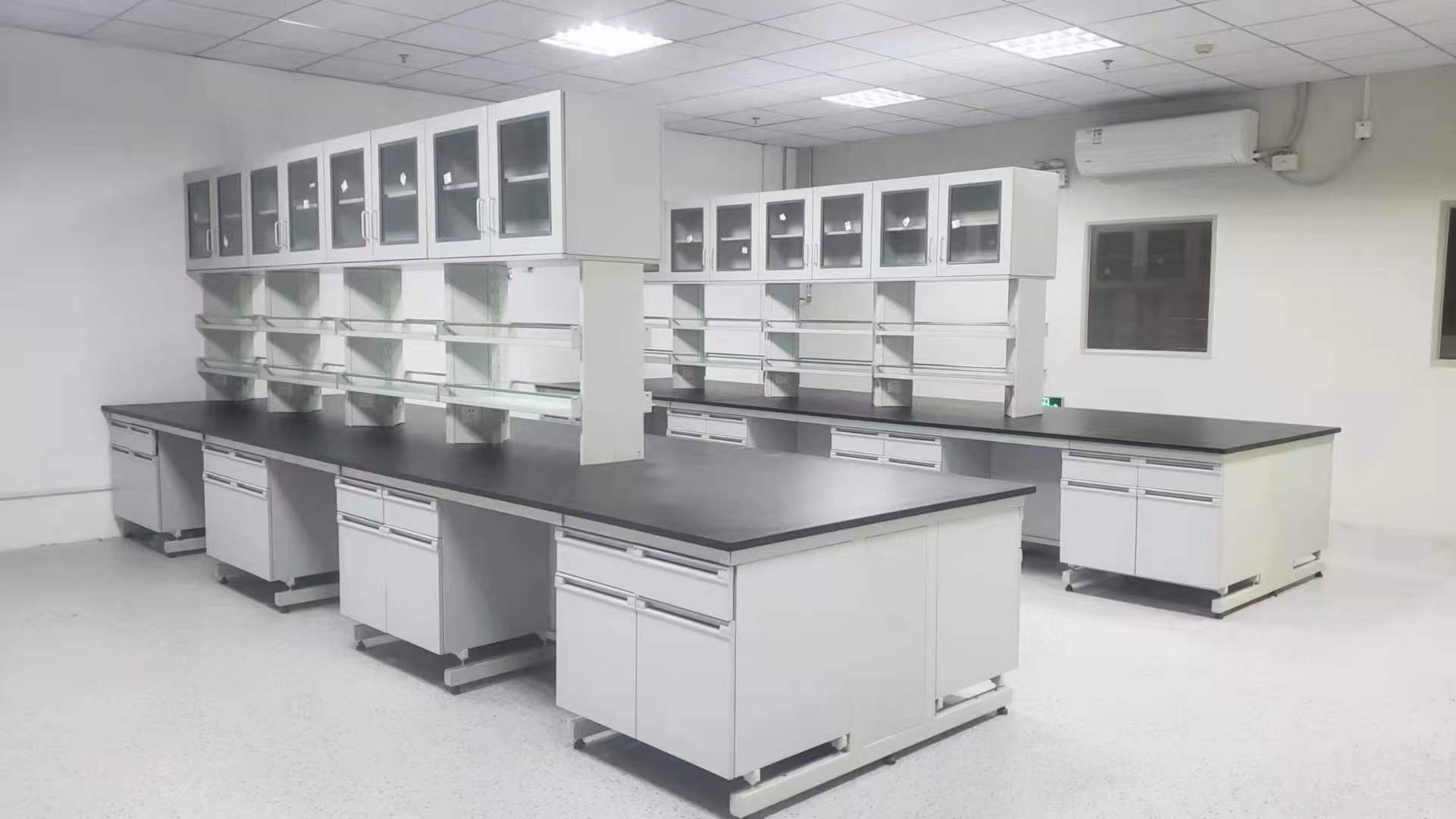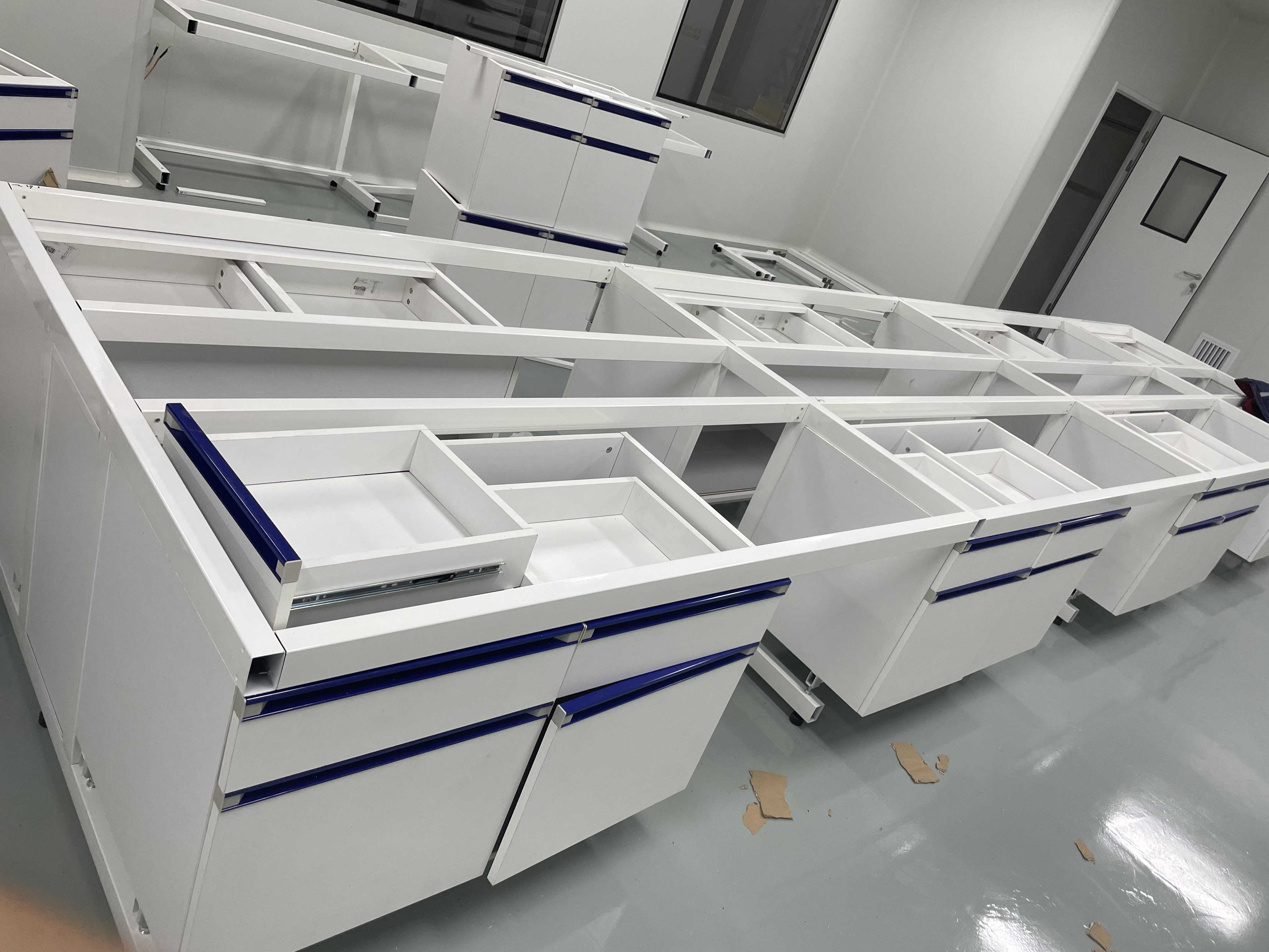 主框架(钢架)采用38*58*1.2~1.8mm或30*50*1.2~1.8mm厚钢管(默认1.2mm厚钢管),下托料20*40*1.2mm厚钢管,成为实验台的主要支撑结构,台面与钢架结构连接后可承受300kg/m²的荷重。表面环氧树脂粉末静电喷涂,高温固化,耐腐蚀,防酸碱。